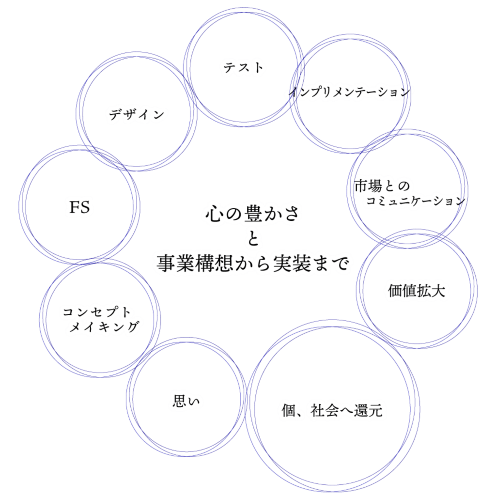 我々のプロジェクトデザインは、まず個人の思い(存在次元)から、その思いを大切にしながら、全体をデザインしてゆきます。そこからより実践的な活動を経て市場とのコミュニケーションを続け、維持継続ができる、世に貢献できる事業へと昇華させて行きます。